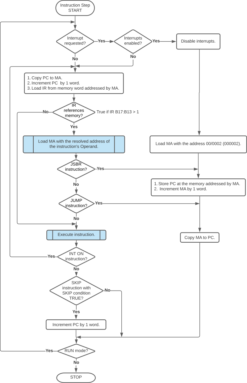 The Processor executes an instruction as illustrated in the following flow chart, where the symbolic Instruction Register (IR) holds the 17-bit instruction under execution: