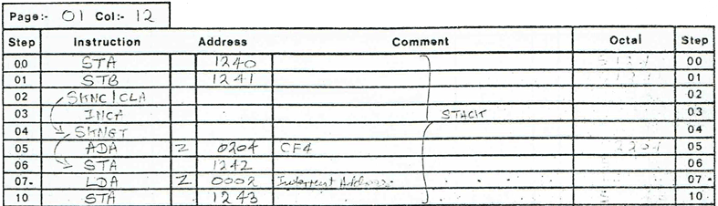 Programmers normally prepared their coding sheets at their desk. When you were ready to try out your code, you found an available terminal in the computer room and used the OP utility to load it in six-digit octal words. Beginners would first write all the octal machine code onto the coding sheets but after a little practice this became counter-productive except occasionally, when constructing subroutine control words for example. With just the two registers, page addressing, a modest instruction set and the adoption of octal notation everyone quickly became expert at assembling machine code on the fly at the terminal, especially as the OP utility echoed back the assembler decode as you typed.