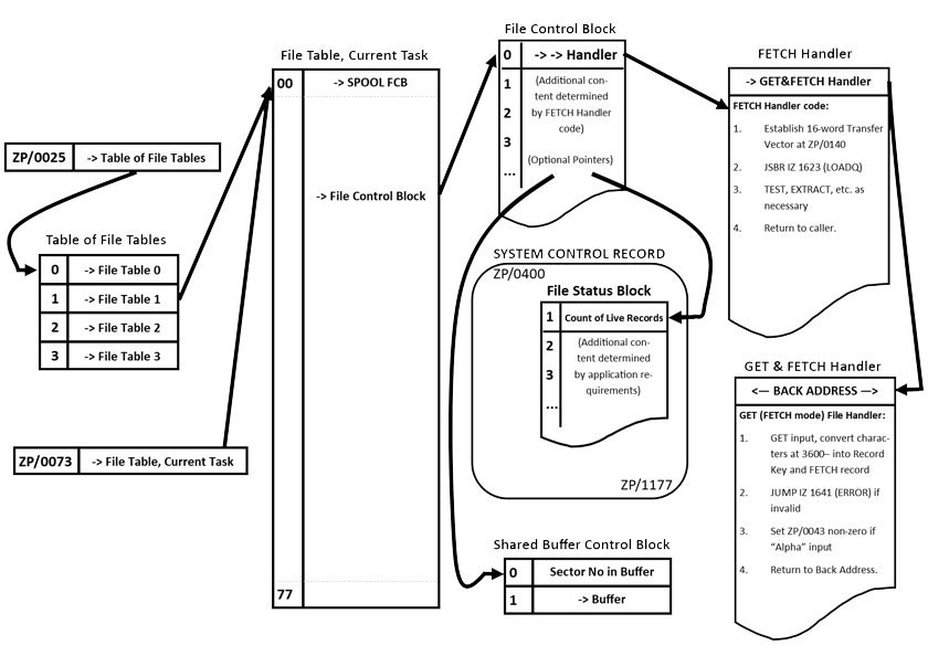 Because all the programs at an installation use the same File Identifier for each specific logical file (Spool File, Customer File, Product File etc.) the File Control Blocks (defining the attributes and storage location of the physical dataset) are established by the Initiator from information within the Configuration Table on bootstrapping. Individual programs do not, therefore, need to open (or close) files as they are already "pre-opened" by the system and remain so in the absence of any close/open facility.