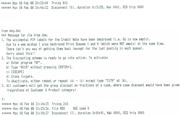 LOGON would only be done by prior arrangement after everyone had gone home. When the time came to run the new code it could be a little nerve-racking knowing that any crash could not be dealt with until the next morning, though the outcome could be reported via a message sent to the remote QX10 log: